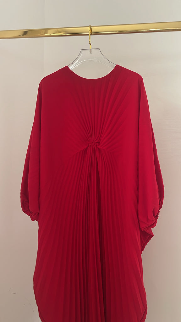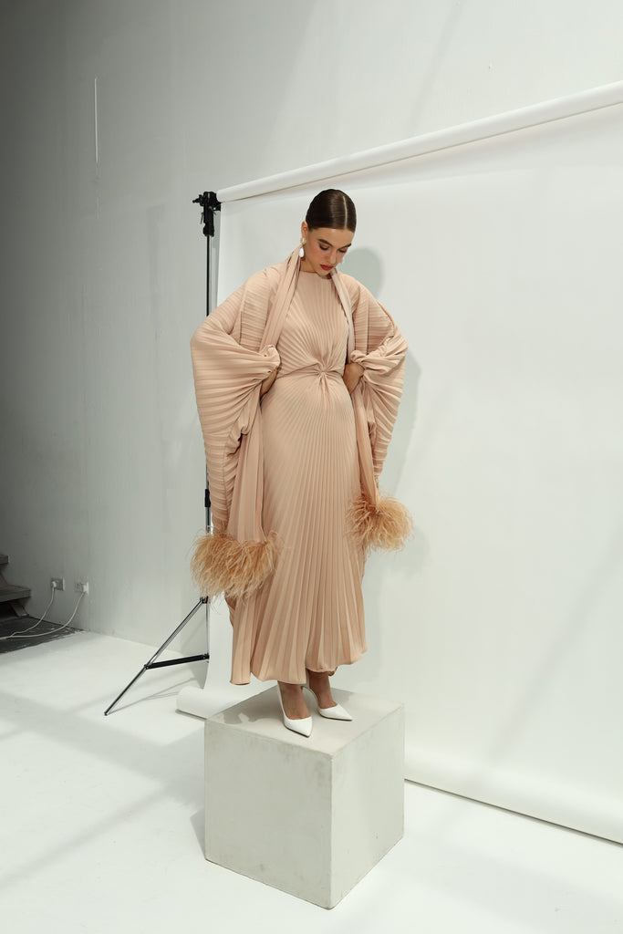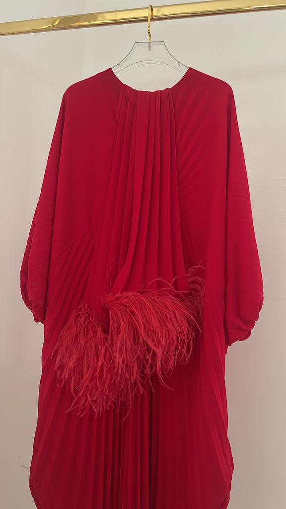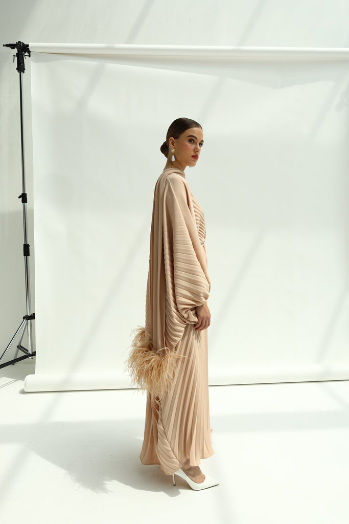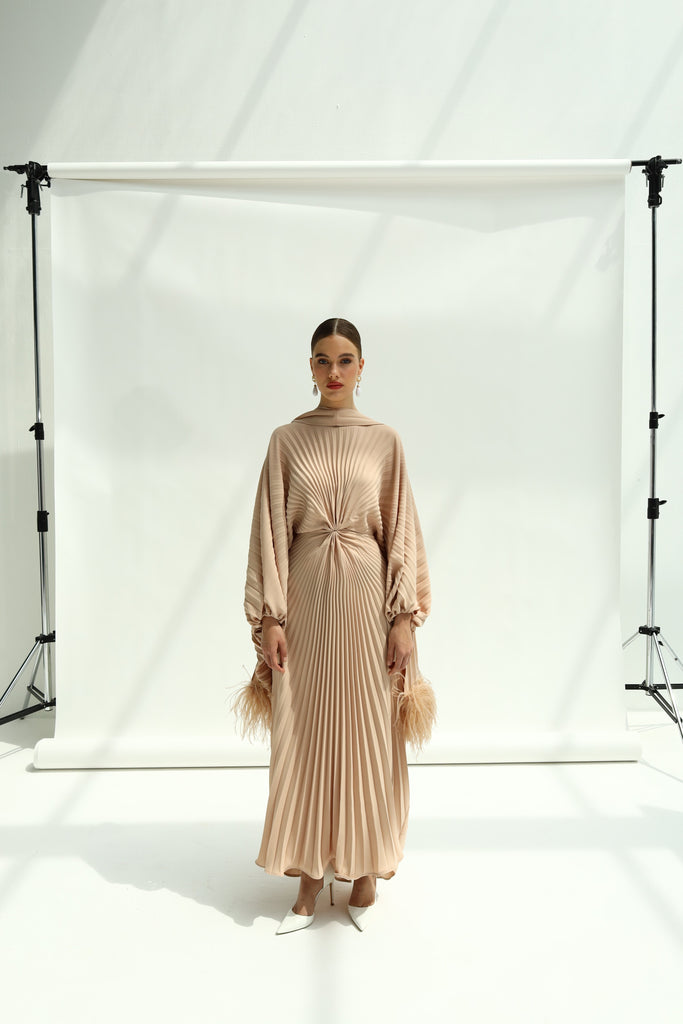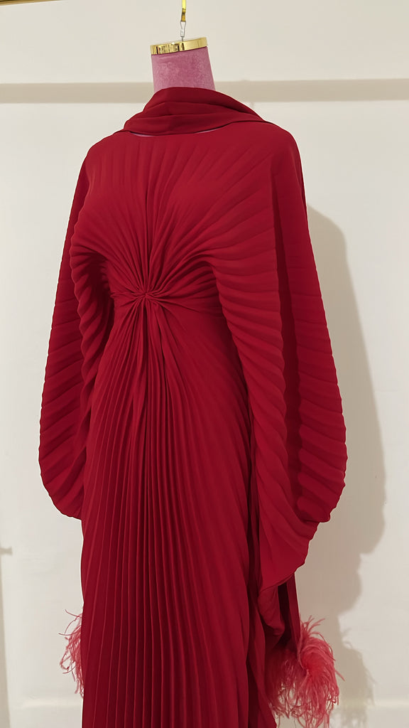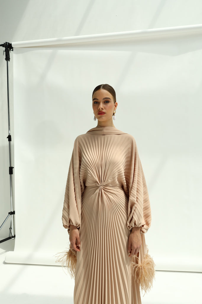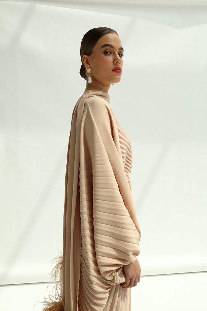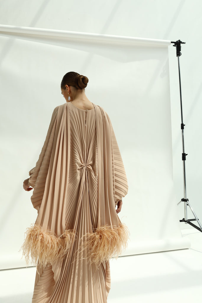 A pleated crepe kaftan, elastic gathered cuffs, and a self-tie waistbelt stitched from the inside with a matching pleated feather-trimmed scarf